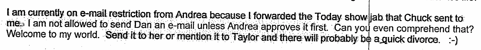 He literally starts off the email with, “I am currently on email restriction from Andrea because I forwarded the Today show jab that Chuck sent to me. I am not allowed to send Dan an email unless Andrea approves it first. Can you even comprehend that? Welcome to my world. Send it to her or mention it to Taylor and there will probably be a quick divorce :-)”
