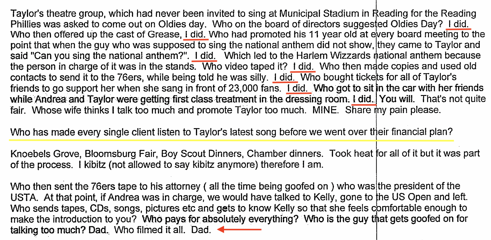 “Taylor’s theatre group, which had never been invited to sing at Municipal Stadium in Reading for the Reading Phillies was asked to come out on Oldies Day. Who on the board of directors suggest Oldies Day? I did. Who then offered up the cast of Grease? I did. Who had promoted his 11-year-old at every board meeting to the point that when the guy who was supposed to sing the national anthem did not show, they came to Taylor and said ‘Can you sing the national anthem?” I did. This led to the Harlem Wizards national anthem because the person in charge of it was in the stands. Who videotaped it? I did. Who then made copies and used old contacts to send it to the 76ers, while he was being told he was silly? I did. Who got to sit in the car with her friends while Andrea and Taylor were getting first-class treatment in the dressing room? I did. Whose wife thinks I talk too much and promote Taylor too much? MINE. Share my pain please.”