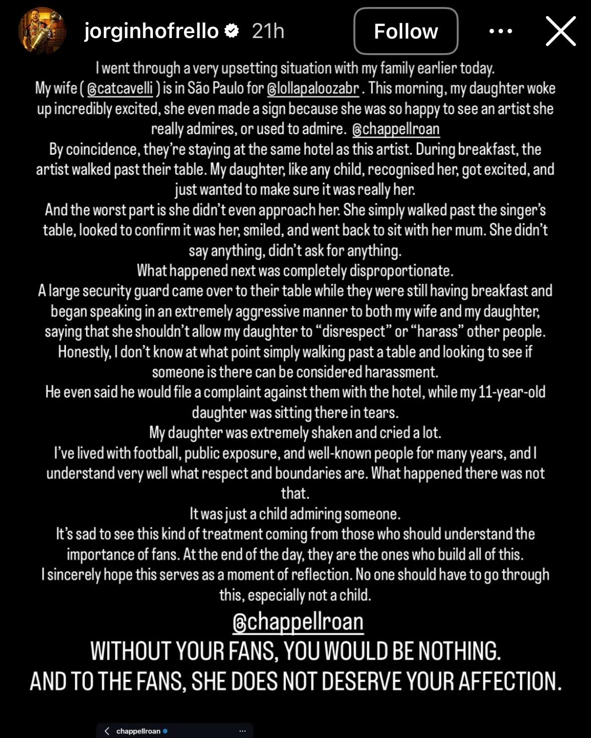 Soccer player Jorginho claimed that during a stay at a hotel in São Paulo in March 2026, his 11-year-old daughter, Ada, was left in tears after being aggressively scolded by a security guard for simply smiling at Chappell Roan as she walked past.