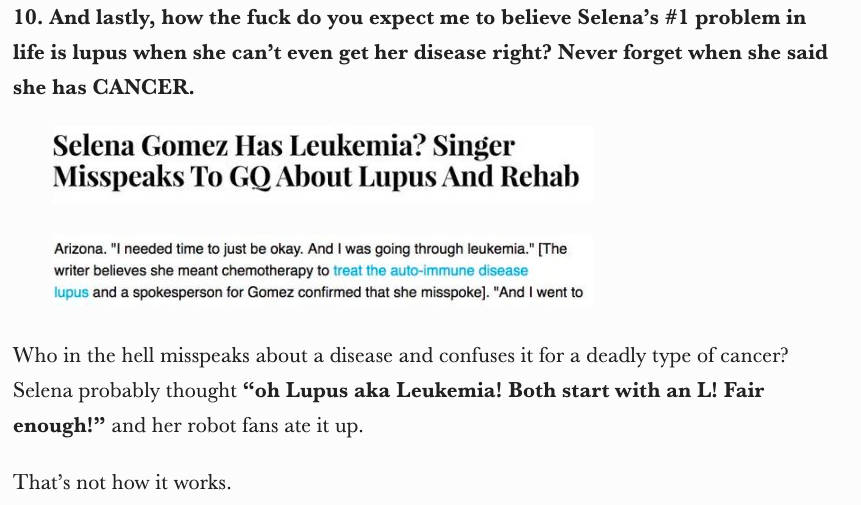 I only restated my points on lupus again because I don’t want the conversation going from “Selena’s health is so bad” to you guys focusing on “but-but-but you said this about lupus!” I wanted to clarify.