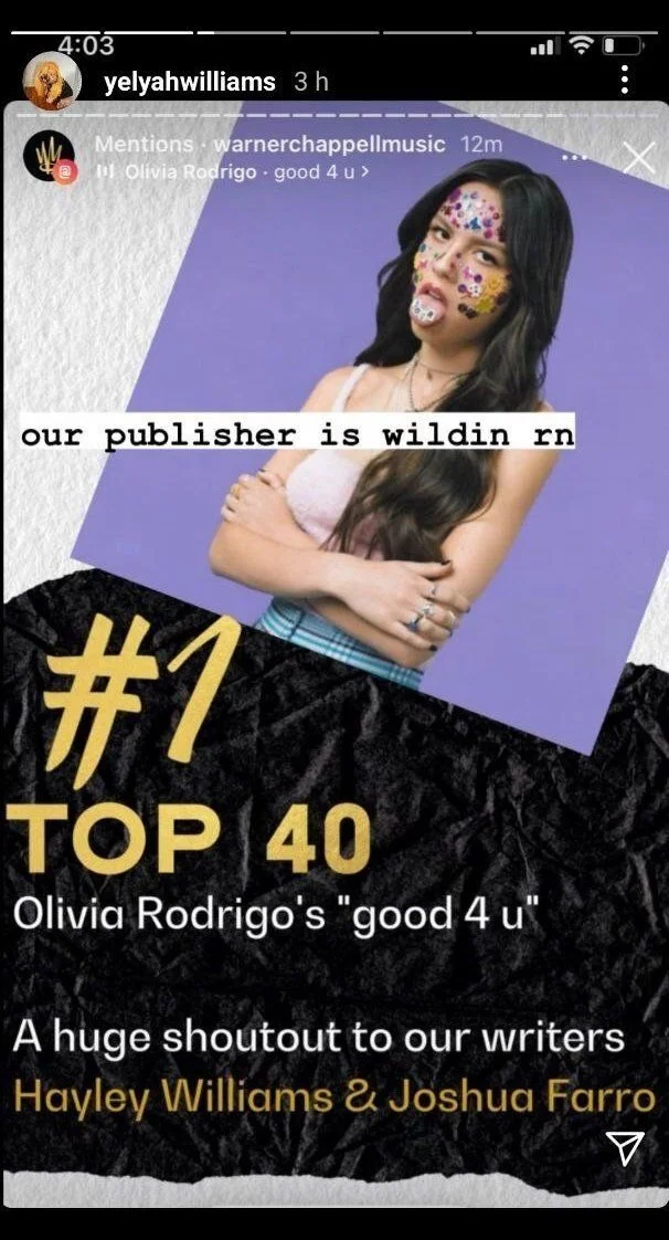 August 25, 2021 — Olivia gives writer’s credits to Paramore on Good 4 U