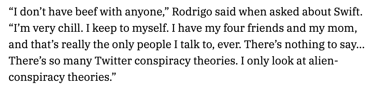 Olivia says she has no beef with Taylor, but notice how she didn’t say “I love Taylor! She’s my idol” or “She’s always inspiring.” Nah, she kept it chill and moving because at the end of the day, she doesn’t want to feud with Taylor but she can’t forgive what she did to her as she sings in The Grudge.